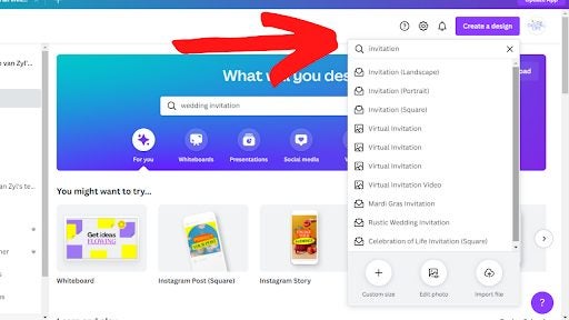 Now you can start with your wedding invitation by selecting the ‘Create Design’ button, and if you don’t see the invitation on the drop-down menu, you can search ‘Invitation.’